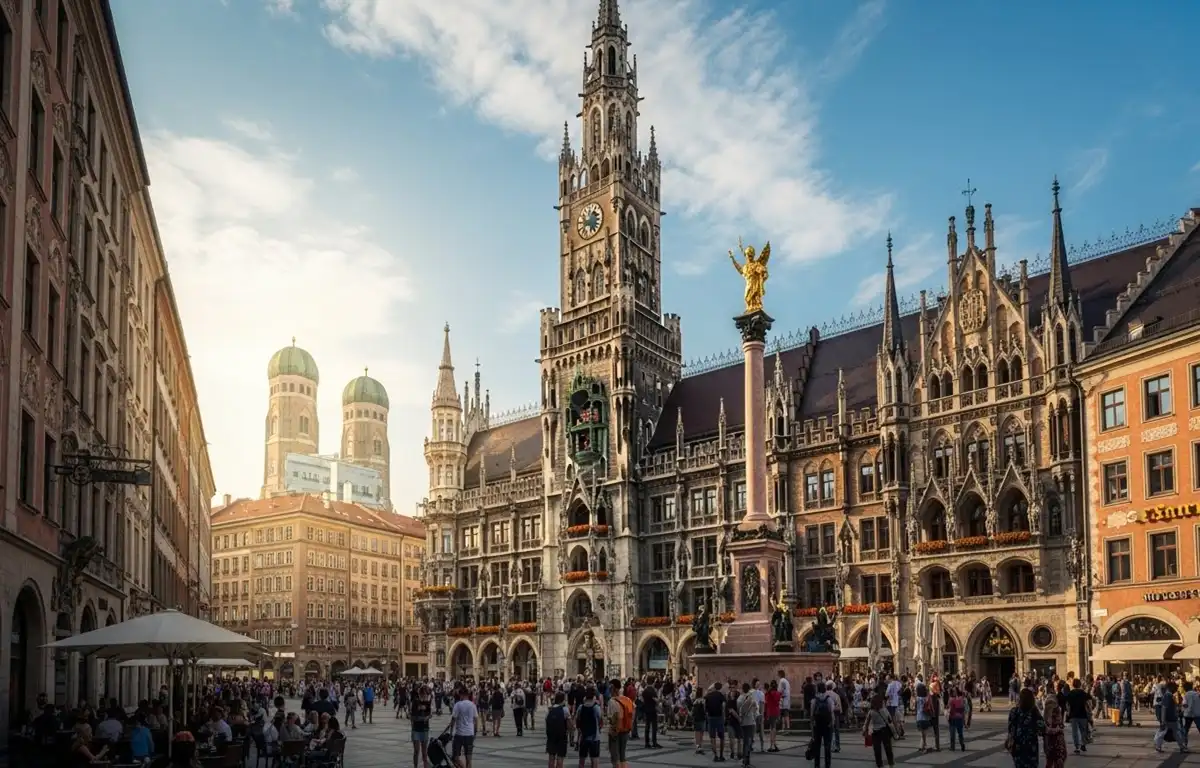 O Marienplatz é a principal praça de Munique, famosa por seu Rathaus, o impressionante edifício da prefeitura que apresenta um famoso relógio com figuras mecânicas que se movimentam a cada hora.