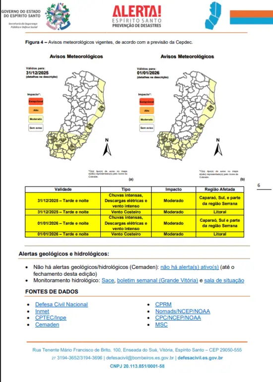 O último boletim de 2025 traz boas notícias para quem quer ver os fogos, mas exige atenção redobrada com as estruturas na areia. Enquanto o sol brilha na Grande Vitória , um aviso de vento moderado está ativo para todo o litoral , e as regiões do Caparaó e Serrana podem enfrentar pancadas de chuva e descargas elétricas na hora da festa. Saiba o que esperar.