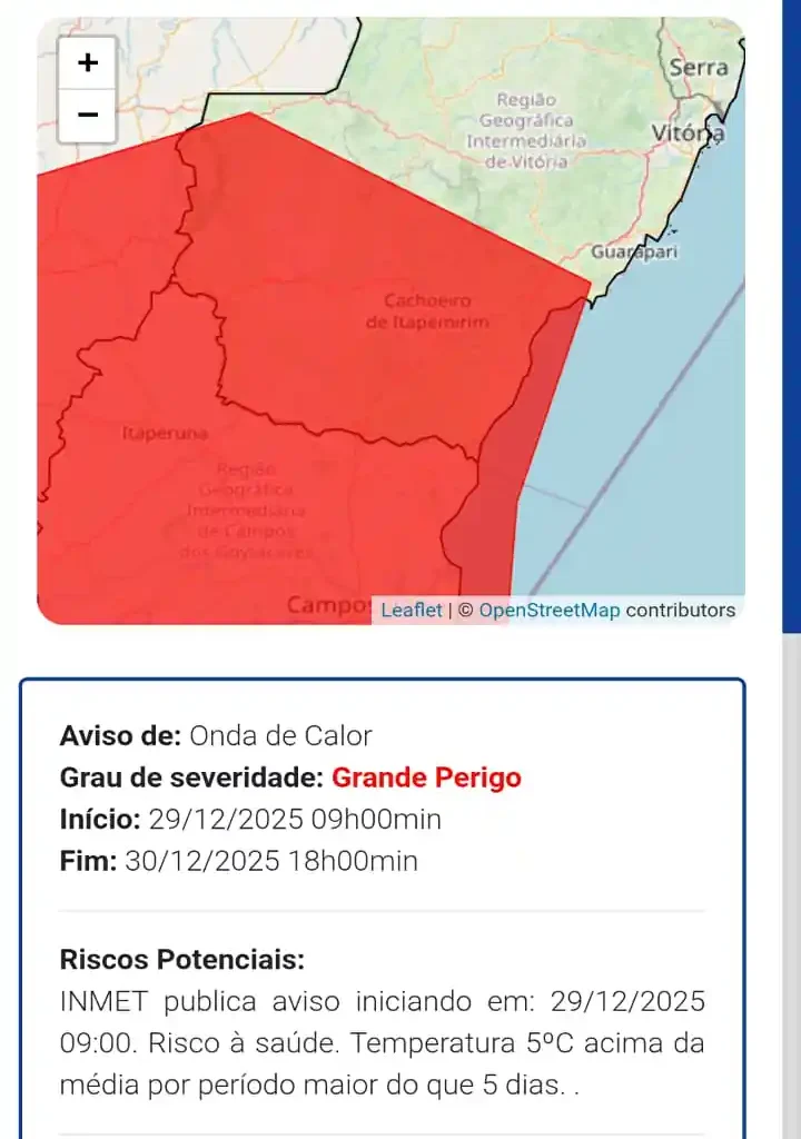 O alerta vermelho vigora até 18h de terça-feira em cidades como Alegre, Anchieta, Apiacá e Bom Jesus do Norte. Autoridades registram temperaturas 5°C acima da média histórica desde 23 de dezembro. Municípios listados incluem Atílio Vivacqua, Cachoeiro de Itapemirim e Itapemirim.