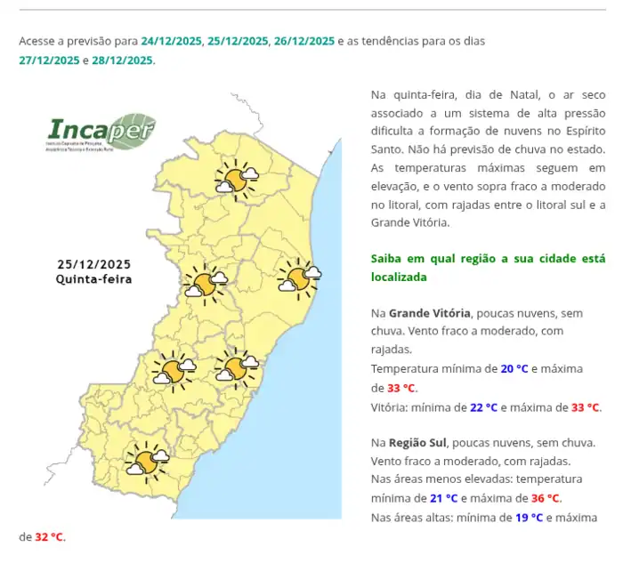 O Natal 2025 no Espírito Santo mantém previsão de tempo seco e quente, com máximas até 36°C e sem chuvas, conforme atualização do Incaper em 24/12 às 09h20.